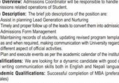 Position: Admission CoordinatorRequired No: 1 (Female)IT Skills: Microsoft Office, E-mails and basic IT knowledgeSalary : NegotiableJob Overview: Admissions Coordinator will be responsible to handle the admissions related operations...